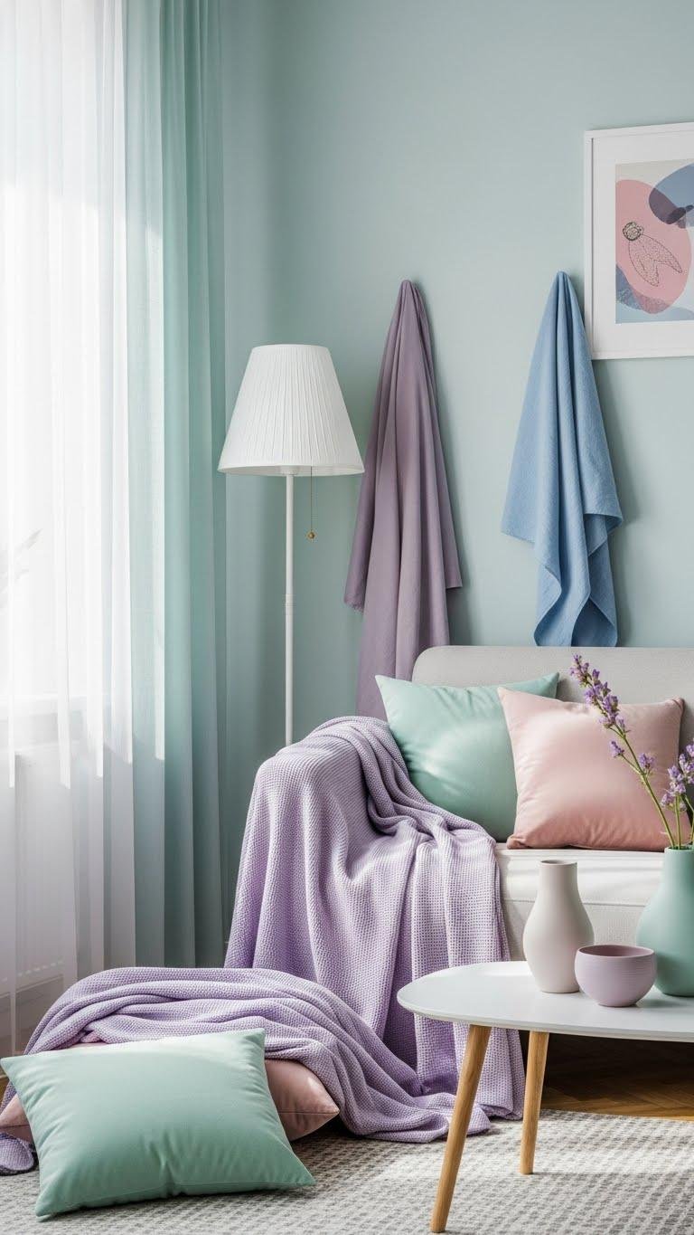 When you swap heavy winter hues for soft pastels, your apartment instantly feels lighter and more inviting; think muted mint, blush pink, lavender, and sky blue layered in small doses.