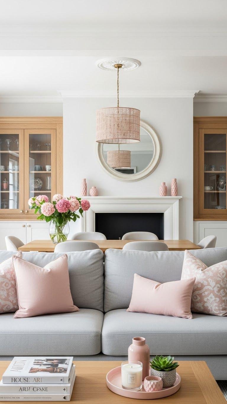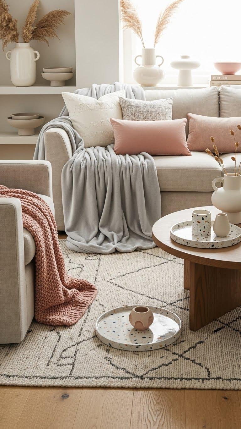 You’ve already seen how blush pieces can lift a neutral scheme; now layer in texture to make those pinks sing. Mix a soft velvet throw over linen cushions, add woven rugs, and scatter ceramic trays with terrazzo accents.