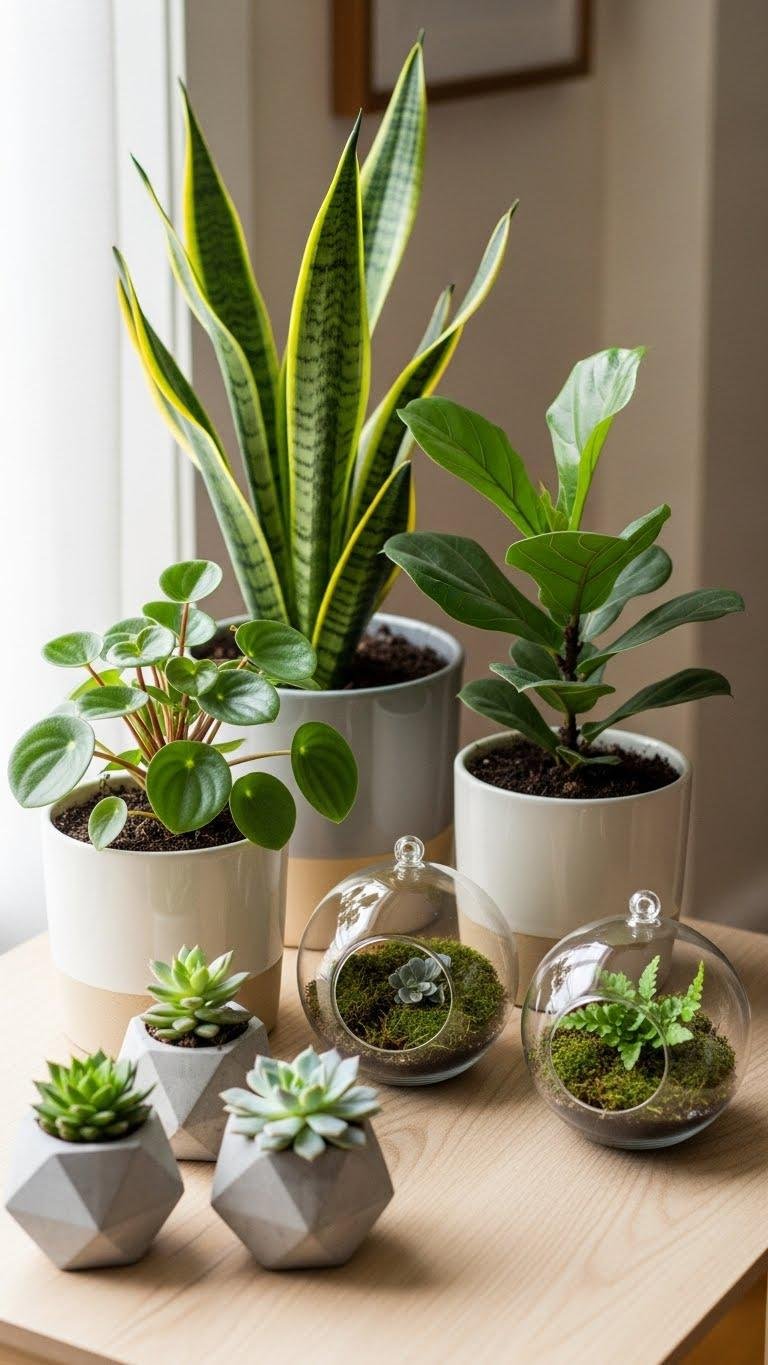 Mix textures with mini terrariums, glazed pots, and corner succulents to create relaxed vignettes. Rotate specimens for light, and keep styling minimal so each piece breathes.