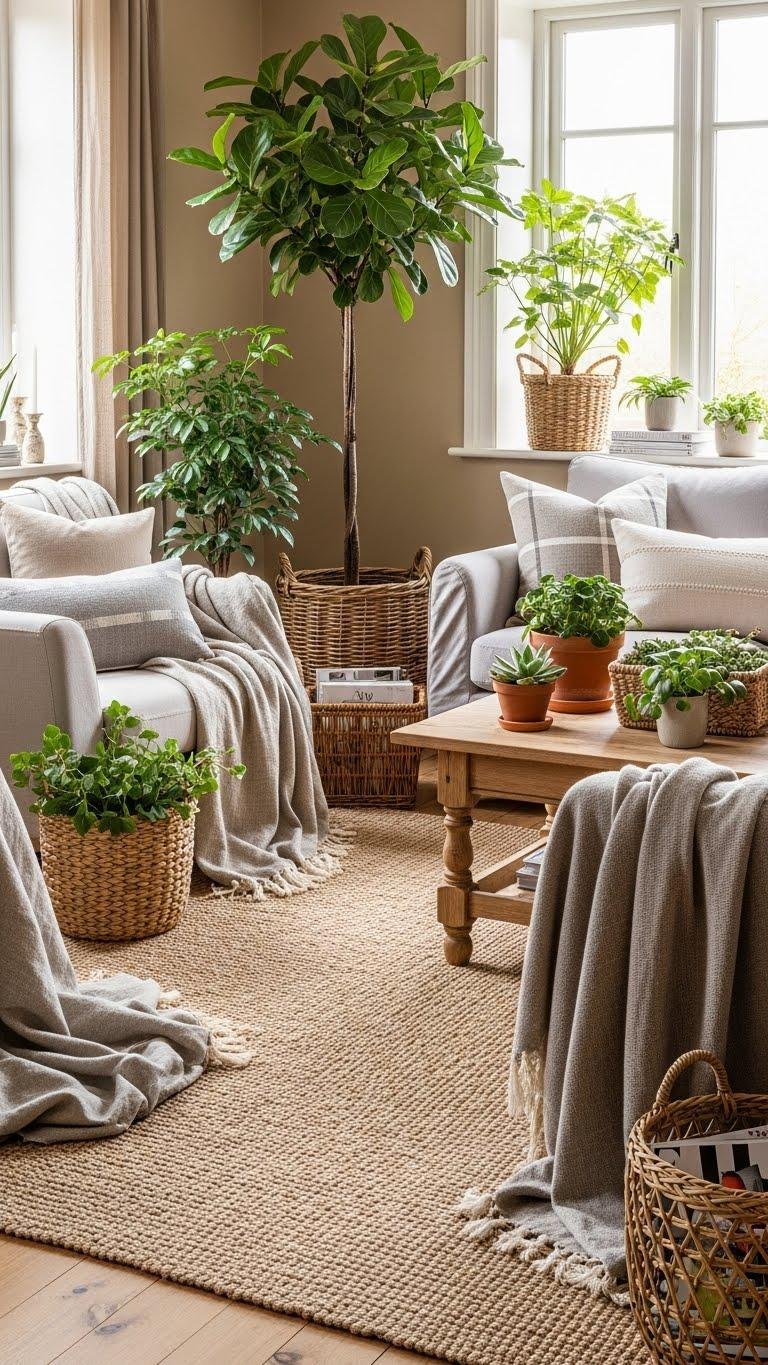 After you’ve set the room’s silhouette with sculpted greenery, layer baskets and blankets to soften the look and add tactile interest. You’ll tuck woven baskets by seating to corral magazines and plants, then drape textured throws over armchairs and sofas.