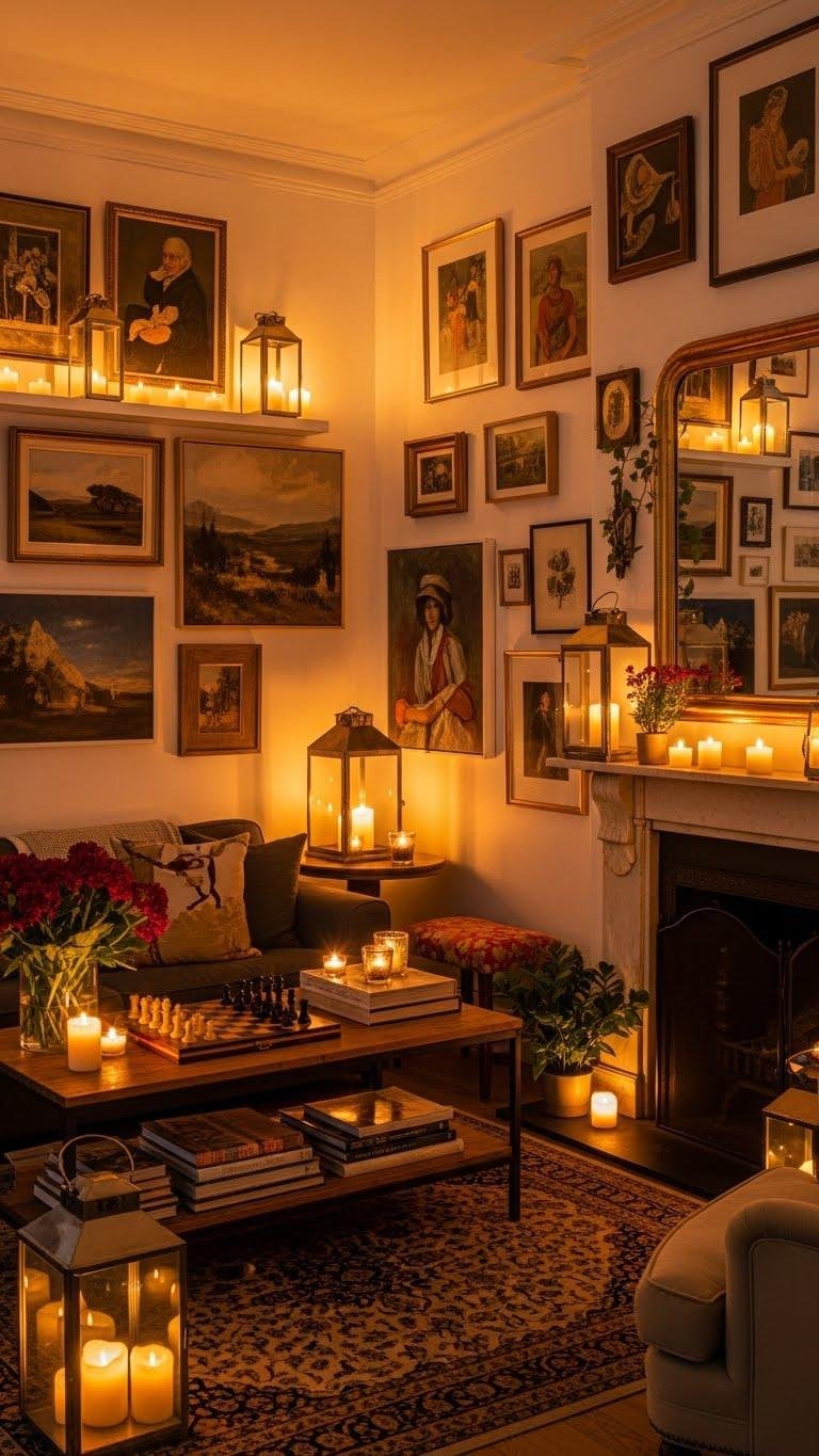 After you’ve set a warm mood with lanterns and candles, let the walls continue the story by selecting art that echoes your color choices; artwork grounded in your palette ties rooms together and makes the glow feel intentional.