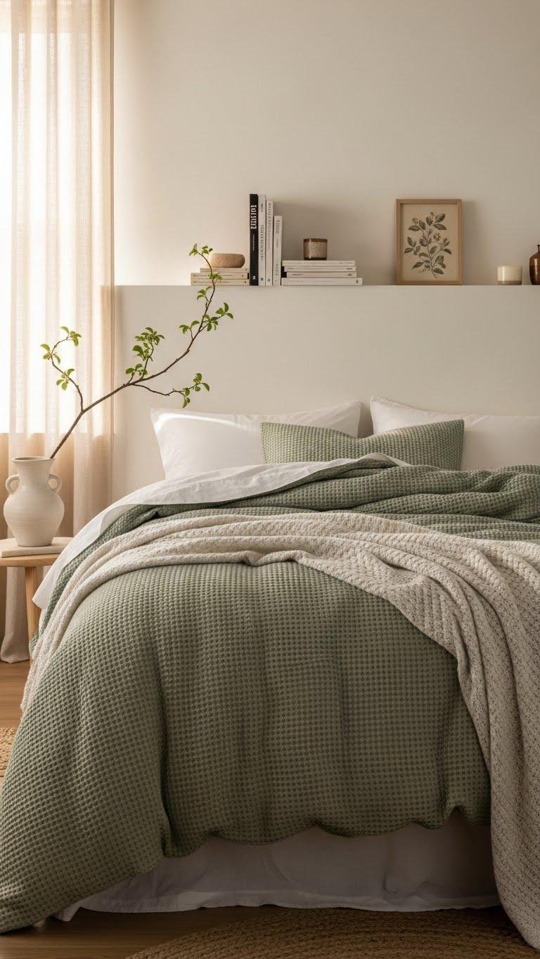 After you’ve pared back a corner with a single sculptural stem, bring that same calm to the bed with a waffle knit duvet cover—its subtle texture reads as relaxed luxury and keeps the room feeling layered but uncluttered.