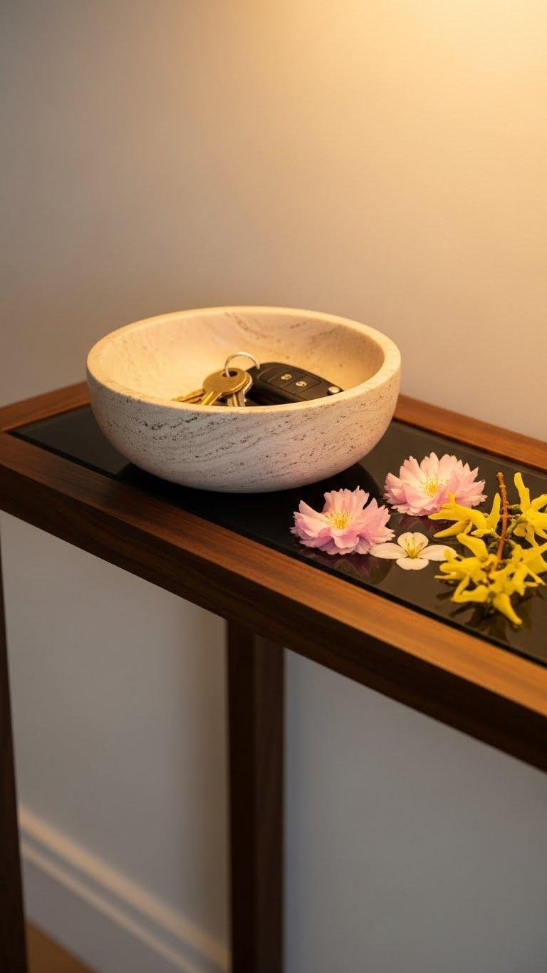 Place a handmade decor bowl to catch keys, or float seasonal florals for softness. Let tactile surfaces contrast clean lines, and adjust hallway lighting to highlight stone textures. It’s a free, curated gesture that feels intentional and effortless.
