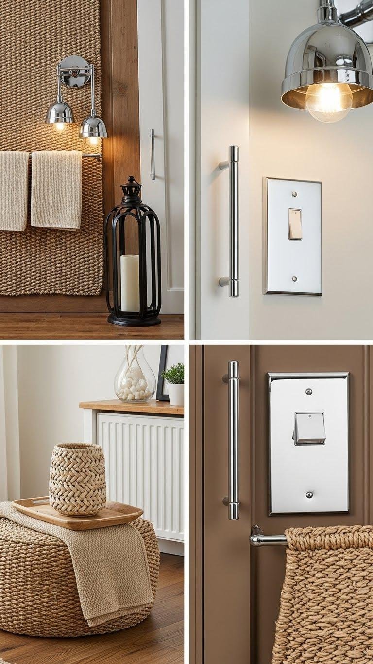 Swap cabinet pulls, switch plates, and light fixtures to create polished contrast; you’ll keep lines clean while hinting at industrial glam.