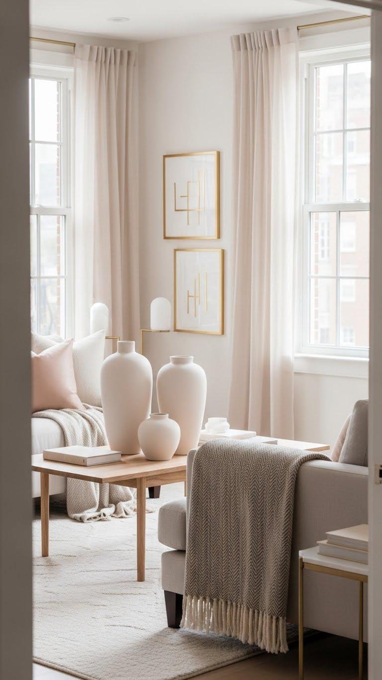 You’ll lean into blush ivory hues, mixing soft neutrals with crisp accents to keep things airy. Play with layered textures for depth—think matte ceramics, woven throws, subtle metallics—so tonal contrast pops without shouting. This scheme lets you craft a liberated, serene apartment vibe.