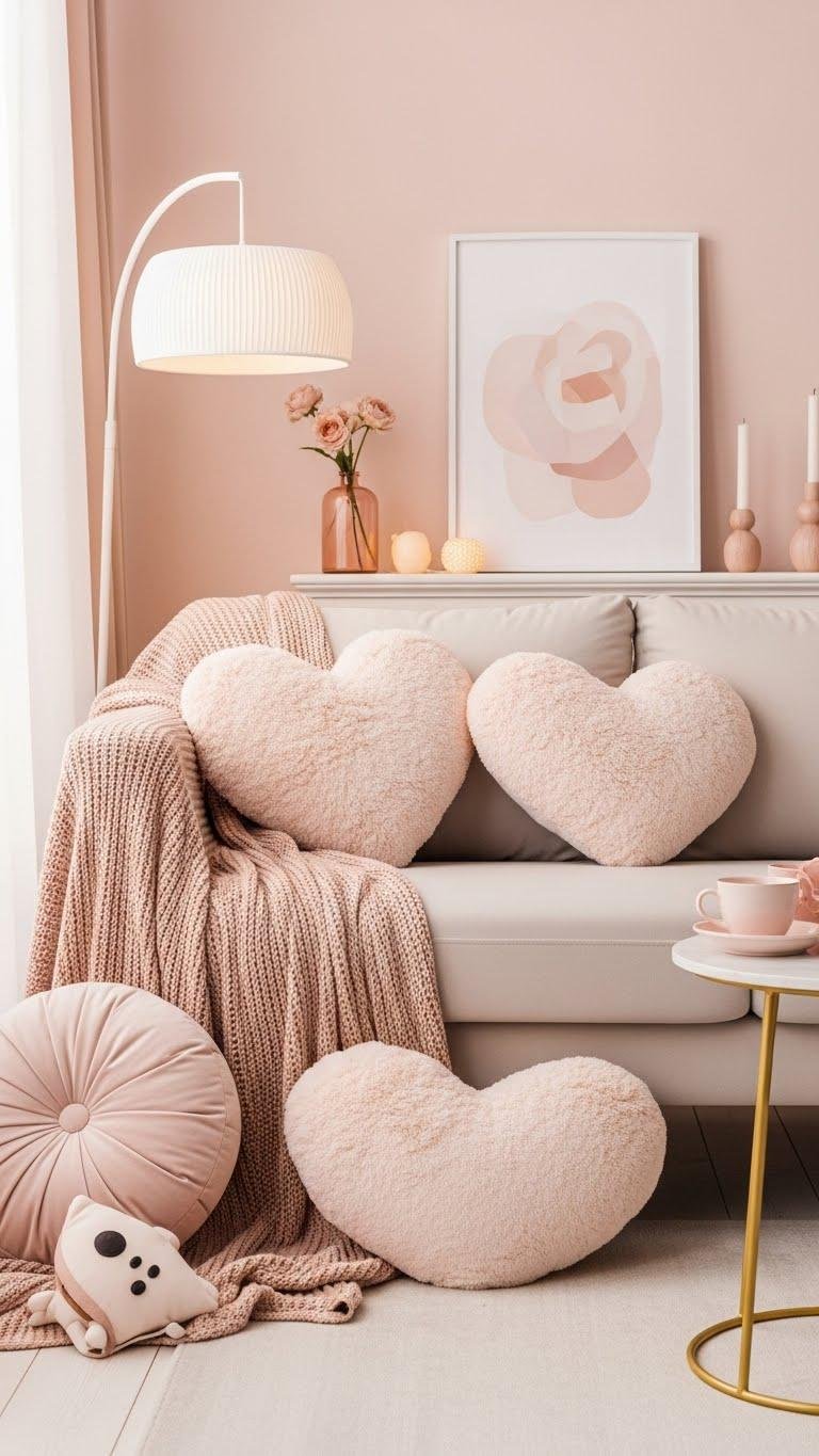 Keep the blush-and-ivory calm by adding velvet heart throw pillows for an instant note of romance and tactility. You’ll mix bold hues and soft neutrals, use texture contrast to elevate a simple sofa, and embrace freedom in playful placement. Follow basic velvet care—spot clean and steam gently—so these chic accents stay plush, wearable, and effortlessly cozy for seasons to come.