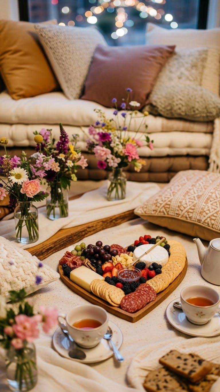 Arrange a heart charcuterie board, set teacups for tea sharing, and let city light frame your intimate, free-spirited moment.