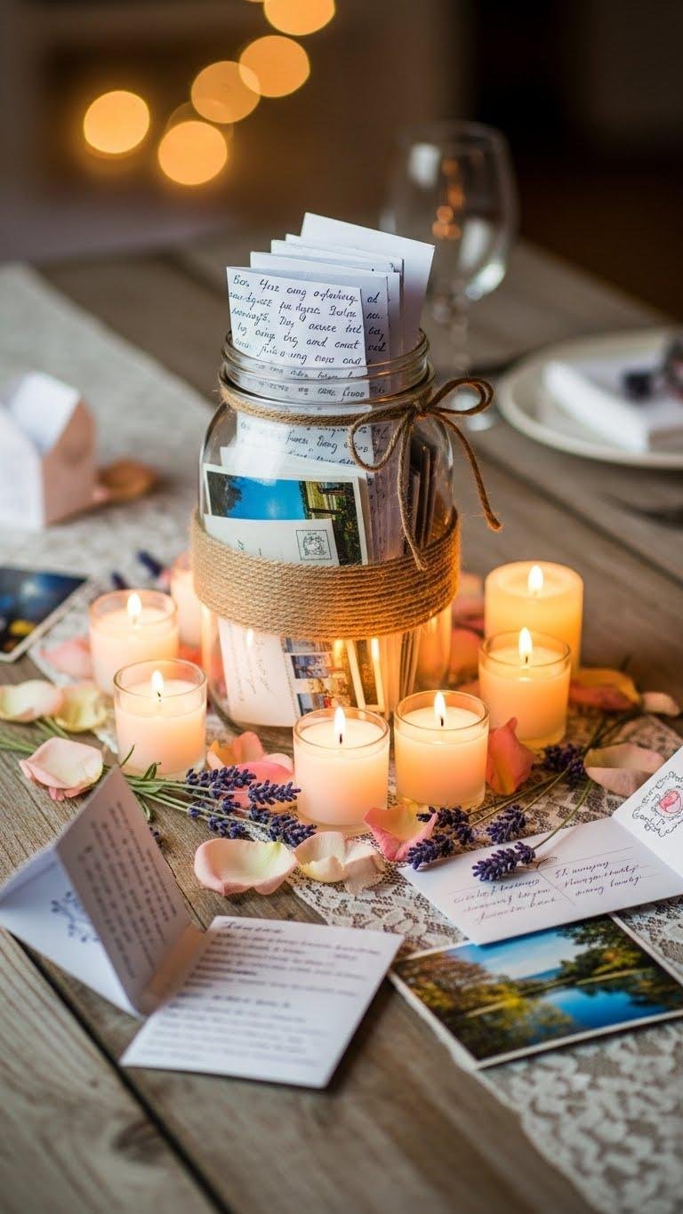 Tuck a love-letter jar into your tabletop styling to add instant romance and storytelling—fill a clear mason or glass jar with folded notes, vintage postcards, or tiny envelopes tied with twine so it reads like a small archive of affection.