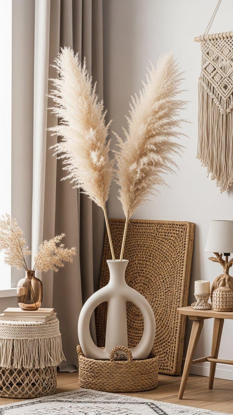 You’ll choose dried pampas in a tall vase for effortless height, pairing it with a boho chic touch and a neutral palette. It’s low-maintenance, free-spirited styling that feels curated, calming, and endlessly adaptable.