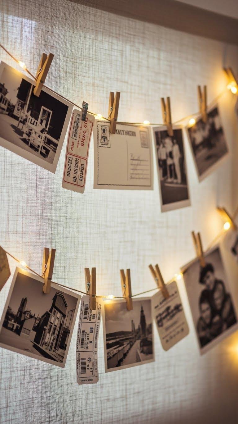 If you want to turn a blank wall into a sentimental focal point, string a simple clothesline across a nook and clip up photos, ticket stubs, and little mementos for an instantly personal display. You’ll use vintage clothespins to hang sepia portraits against a linen backdrop, mixing candid snaps and postcards. Accent with tiny fairy lights for a liberated, warm vignette that feels effortlessly chic.