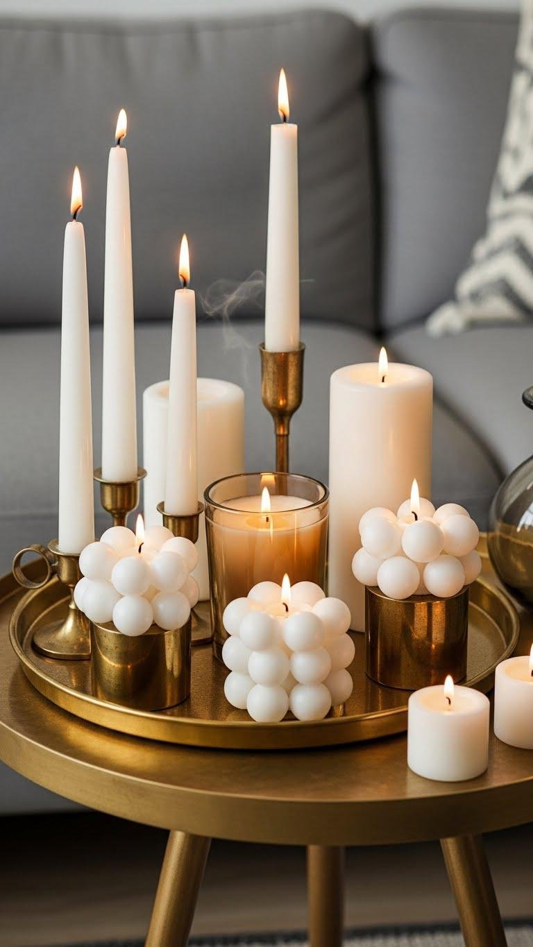 A low brass tray with clustered candles turns a side table into a tiny altar of glow—mix tapered, votive, and pillar shapes for height play and a collected look. You’ll embrace brass patina for warmth, balance metallic shine with matte elements, and arrange candles so airflow’s free. Prioritize candle safety: stable holders, trimmed wicks, and never leaving flames unattended for a liberated, chic vibe.