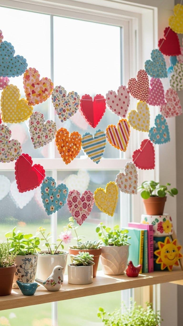 Cut a stack of colorful paper into hearts and string them together for an instant, budget-friendly garland that reads playful and polished.