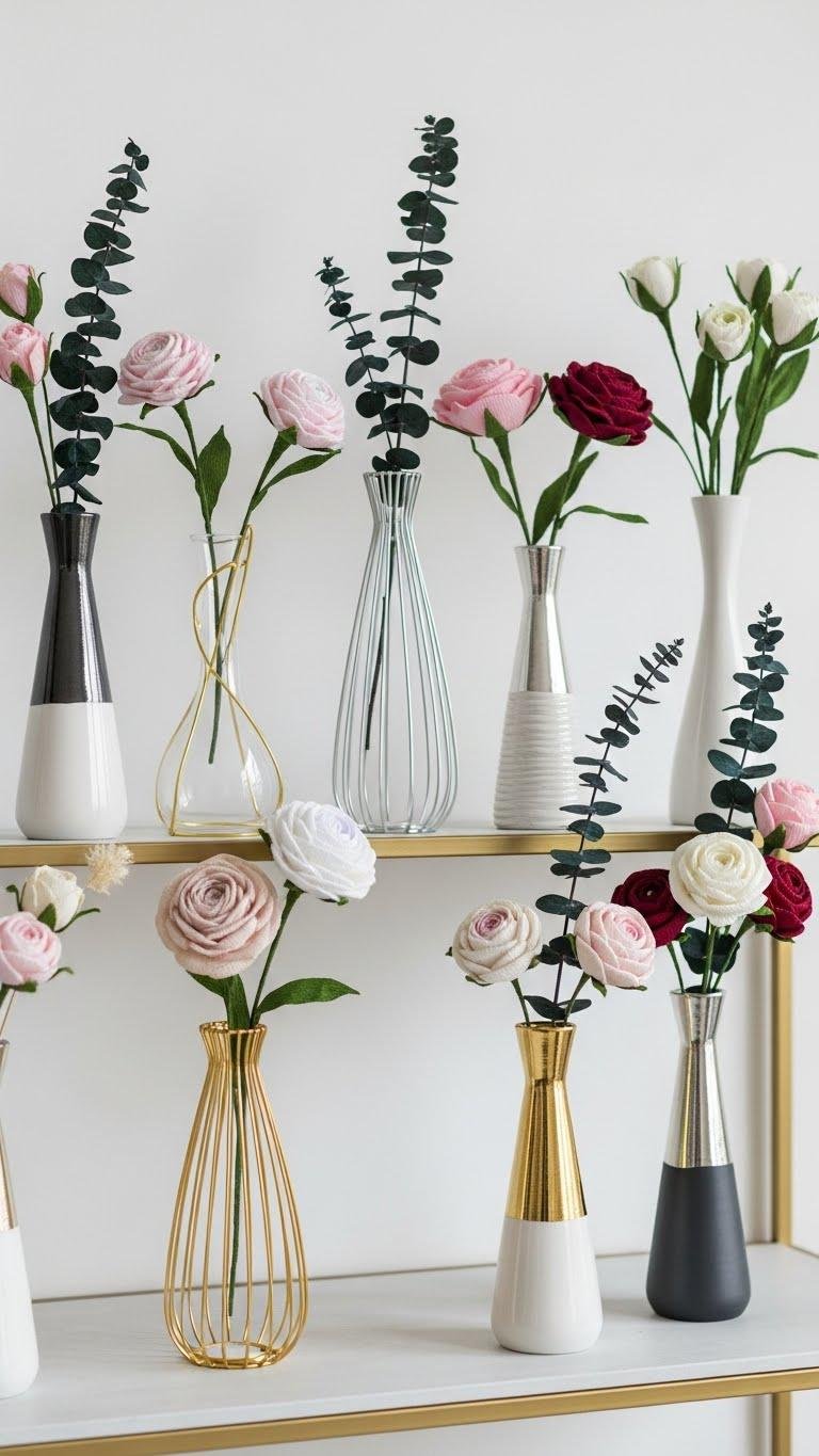 Crafting crepe paper flower bud vases gives you a quick, stylish way to add handcrafted charm to any shelf or windowsill. You’ll fold delicate crepe blooms, nestle stems with dried eucalyptus for texture, and tuck them into slim vases. Add metallic accents—gold wire or painted rims—for edge. It’s an easy, portable update that feels liberated, modern, and utterly you.