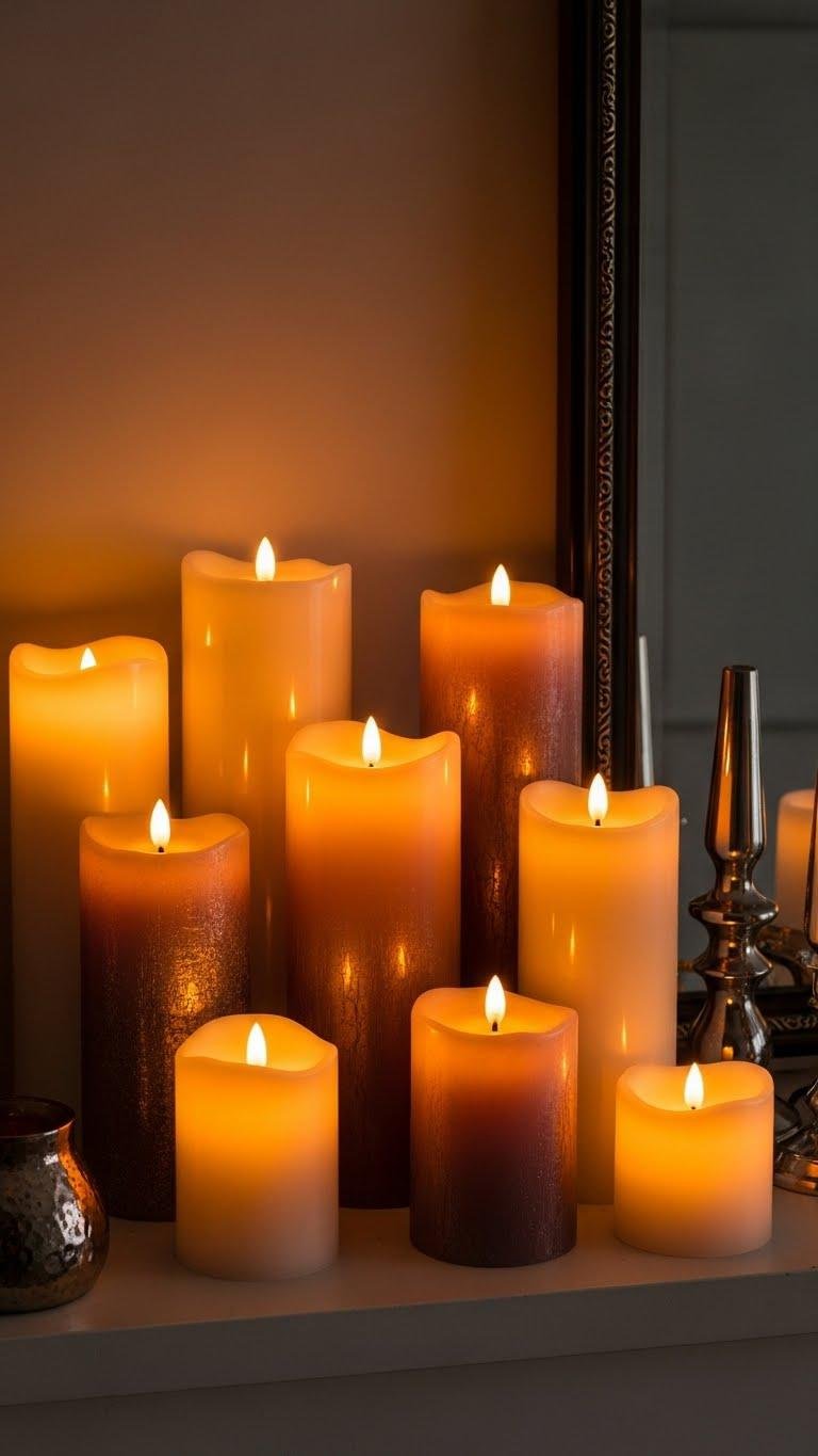 Set a warm, flicker-safe mood on your mantel with a curated display of battery LED candles—mix heights, finishes, and a few real wax pillars to blur the line between authentic and modern. You’ll lean into flicker realism, arrange asymmetrically for effortless chic, and schedule simple battery maintenance. Rotate scents, add metallic accents, and let the glow feel personal, liberated, and endlessly repeatable.