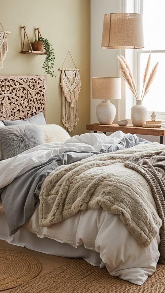 You can turn your bedroom into a soft, winter sanctuary without a full makeover—start with a lofty down duvet and layer in quilted coverlets, chunky knits, and faux fur for instant depth. Aim for warm neutrals, tactile linens, and a mix of Euro shams and lumbar pillows to make the bed look curated, then add dimmable lighting, a plush rug, and a bouclé bench for a hotel-like finish that invites you to keep going.