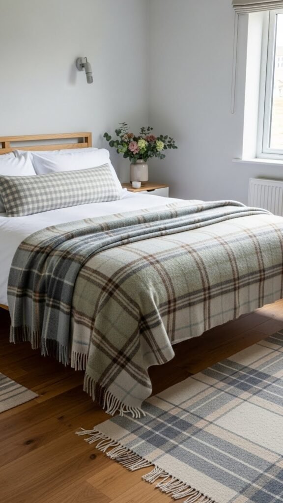 Once you’ve cleared surfaces and stashed extra bedding, bring in pattern selectively to give the room seasonal character without overwhelming its calm. Choose muted tartan throws, a soft gingham lumbar pillow, or a restrained plaid rug to anchor the bed.