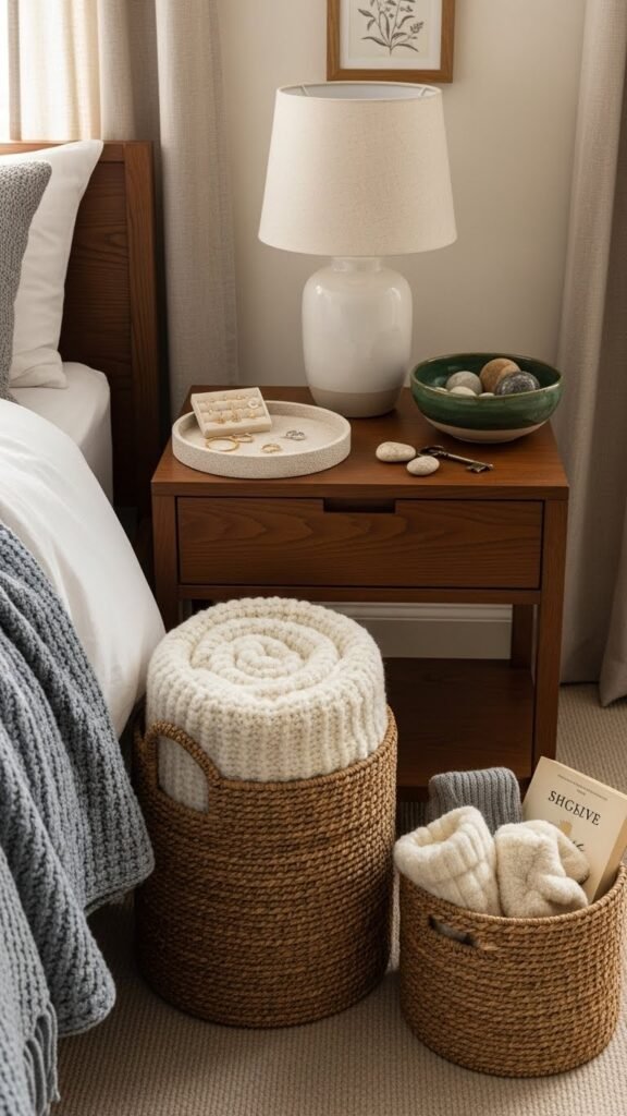 Tuck tactile bedside accessories and woven storage baskets into your nightstand styling to add warmth, texture, and practical order to a winter bedroom. Choose textured trays for jewelry and a ceramic catchall, pair them with woven hampers for blankets.