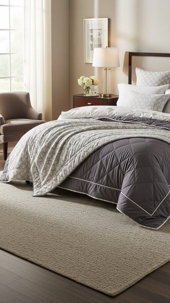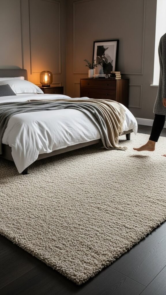 Set a plush area rug under your bed to instantly ground the space and add winter warmth underfoot. You’ll create rug anchoring that defines the sleeping zone while inviting bare feet.