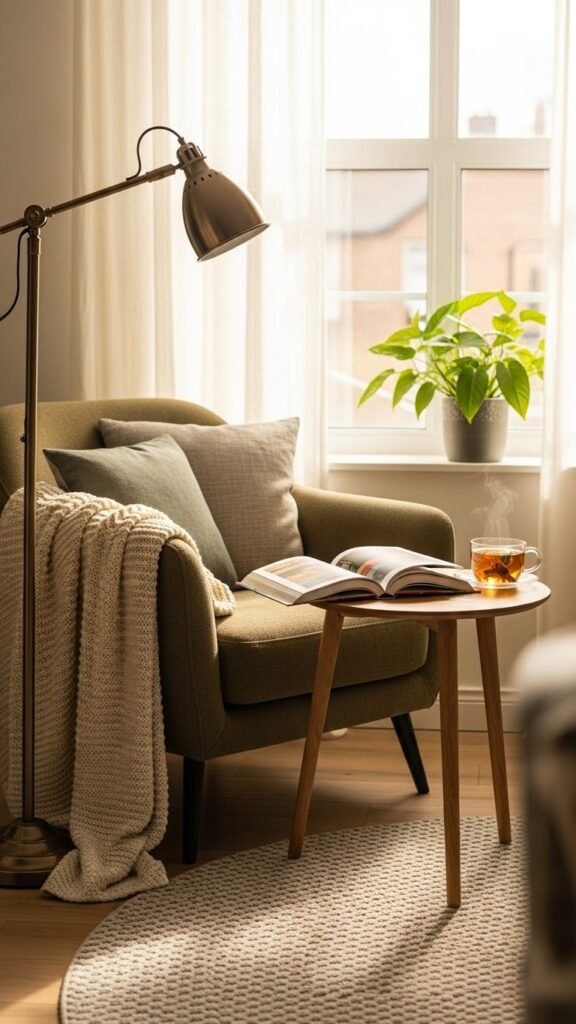 Curl up in an upholstered chair that feels like an invite — plush, scaled to your body, and positioned where light and calm converge. Anchor it near a window seat or beside tall glass for natural glow, add a sculptural reading lamp, a slim side table, and a soft throw.