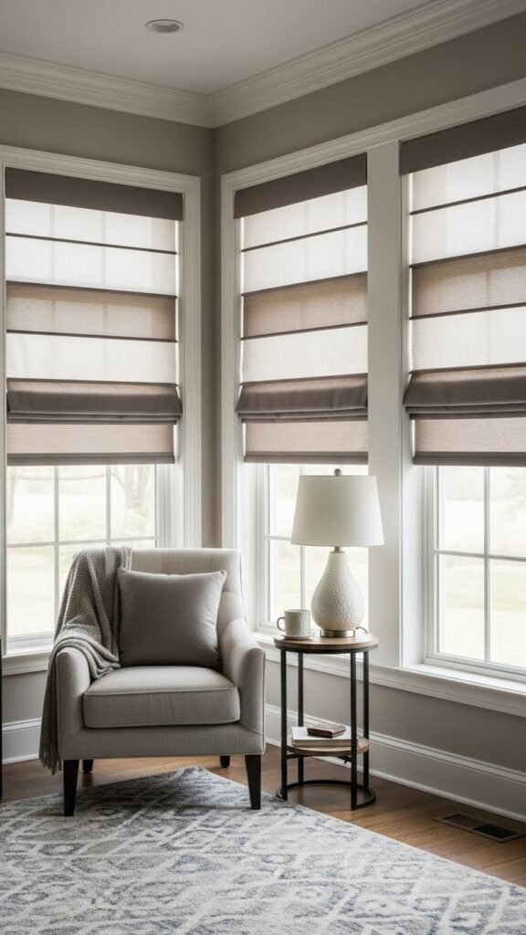 After you’ve carved out a reading nook, turn your attention to the windows that frame it — layered treatments will keep warmth in, sharpen the room’s silhouette, and lift the whole aesthetic. Choose thermal romanblinds close to the glass and pair them with insulated cornices to seal drafts. You’ll command comfort and style, enjoying a liberated, luxe retreat without fuss.