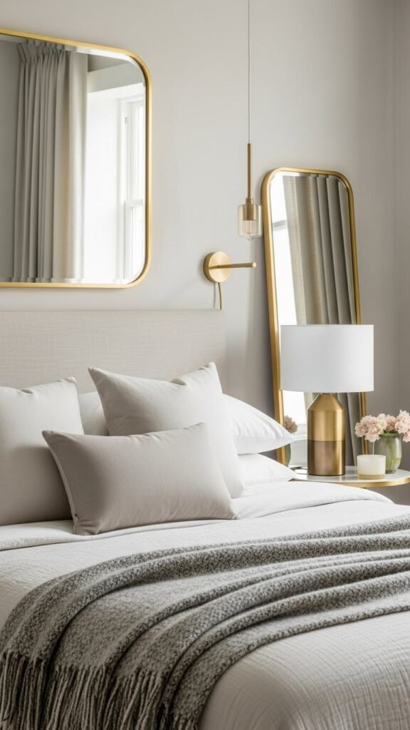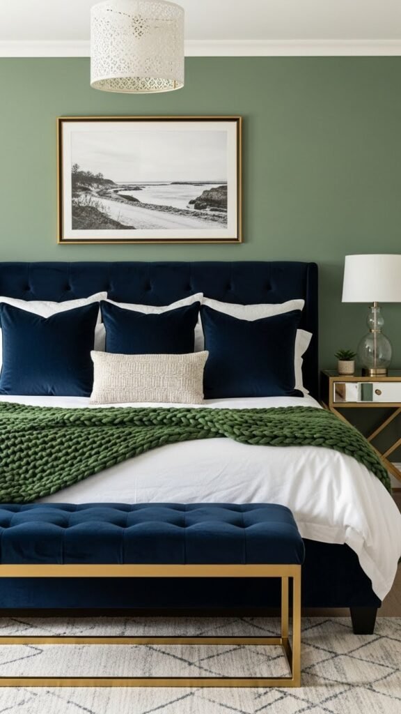 Pairing warm metallics with deep jewel tones lifts a winter bedroom from pretty to polished. You’ll anchor the room with forest green accents—throws, an upholstered chair or art—and introduce navy velvet pillows or a headboard for luxe depth.