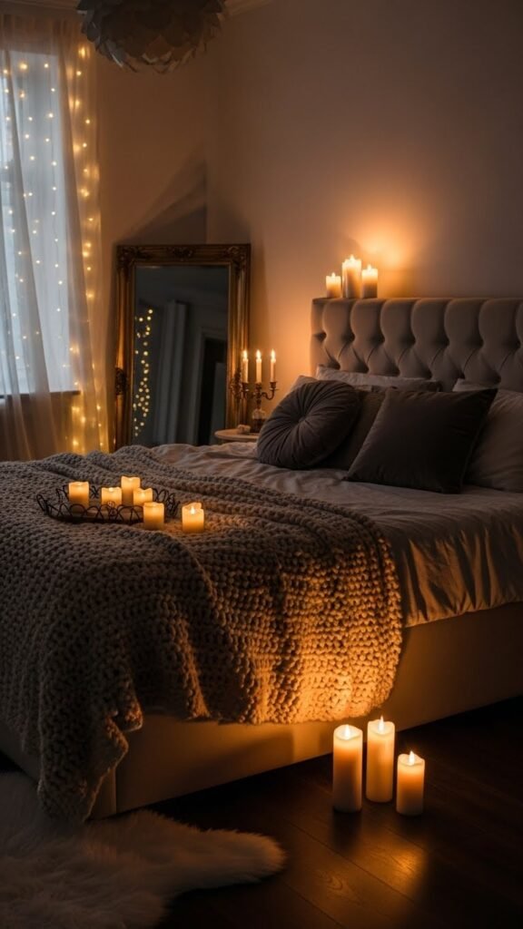 When you swap harsh overhead lights for low-heat LED candles and thoughtfully draped string lights, your winter bedroom immediately feels softer and more intentional. Choose flameless LED candles with warm flicker and cluster fairy lights around a headboard or mirror. You’ll create a liberated, luxe atmosphere without heat or hazard, emphasizing texture, shadow, and calm—simple, modern, totally yours.
