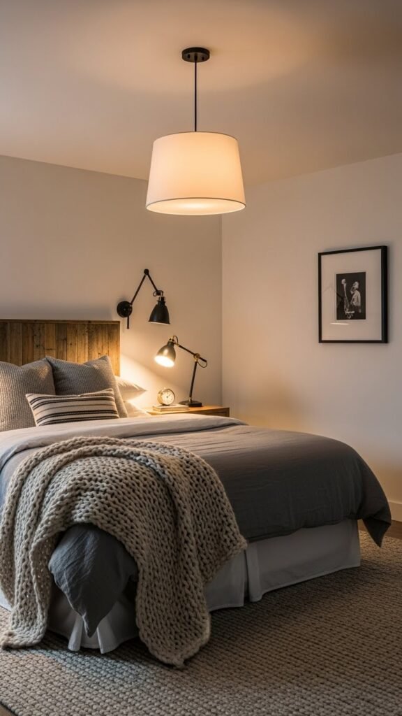 You’ll mix a dimmable pendant for ambient glow with adjustable sconces for reading, plus bedside task lamps for focused warmth. Use dimmers to control mood and sculpt space; choose fixtures with clean lines and tactile finishes so your room feels liberated, luxe, and intentionally calm.