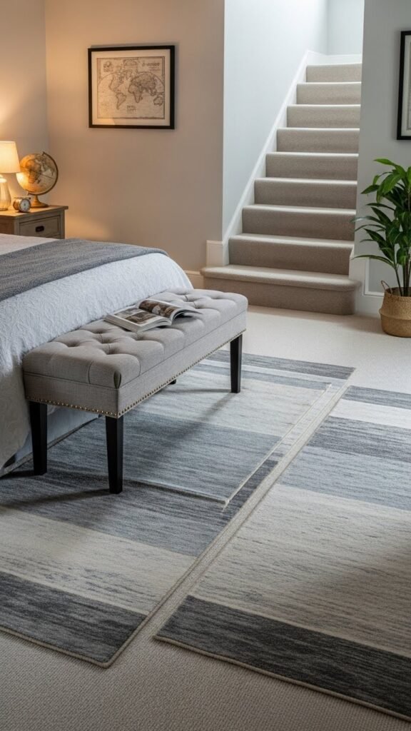 Pairing a plush bench or pouf with layered rugs makes your bedroom feel intentionally edited and warm from the floor up. Layered runners add texture and movement; mix pile heights and subtle patterns to guide your path.