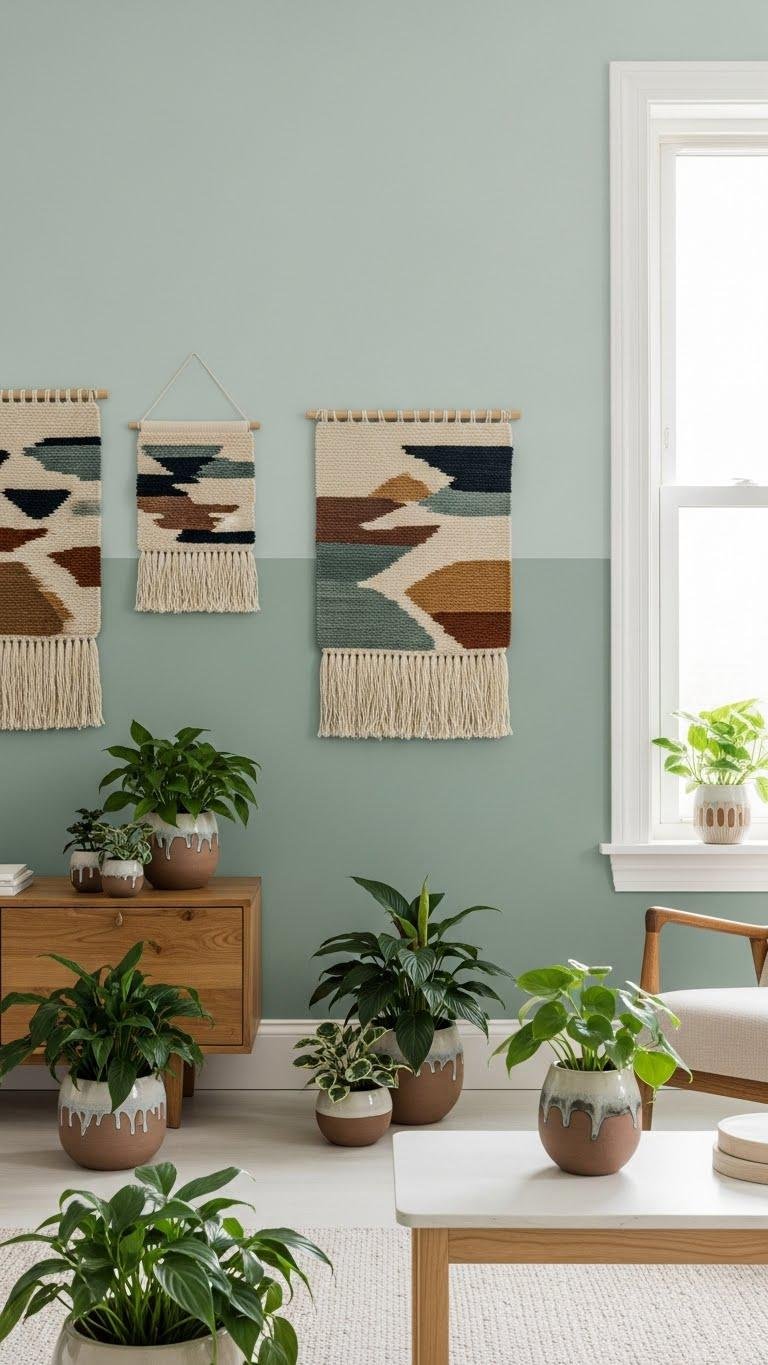 You’ll feel freer with a focused backdrop that spotlights plants, ceramics, or subtle calming murals.