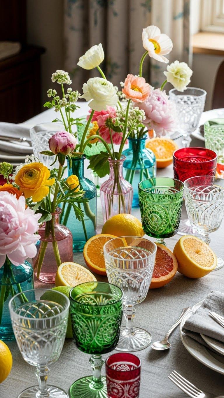 Pull together a collection of vintage glassware to give your dining table character and a sense of history. You’ll mix delicate goblets, juice glasses and small vases to craft effortless seasonal centerpieces that flex with your mood. Arrange varied heights, colors and textures, add fresh blooms or citrus, and let each piece tell a free-spirited story while keeping the look deliberate and chic.