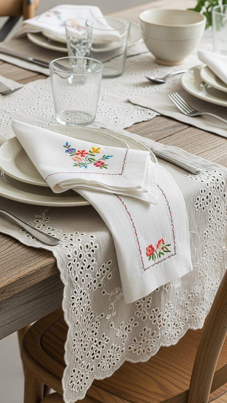 When you layer embroidered linens, you instantly give a table or room a soft, lived-in cottagecore vibe that feels both curated and welcoming.