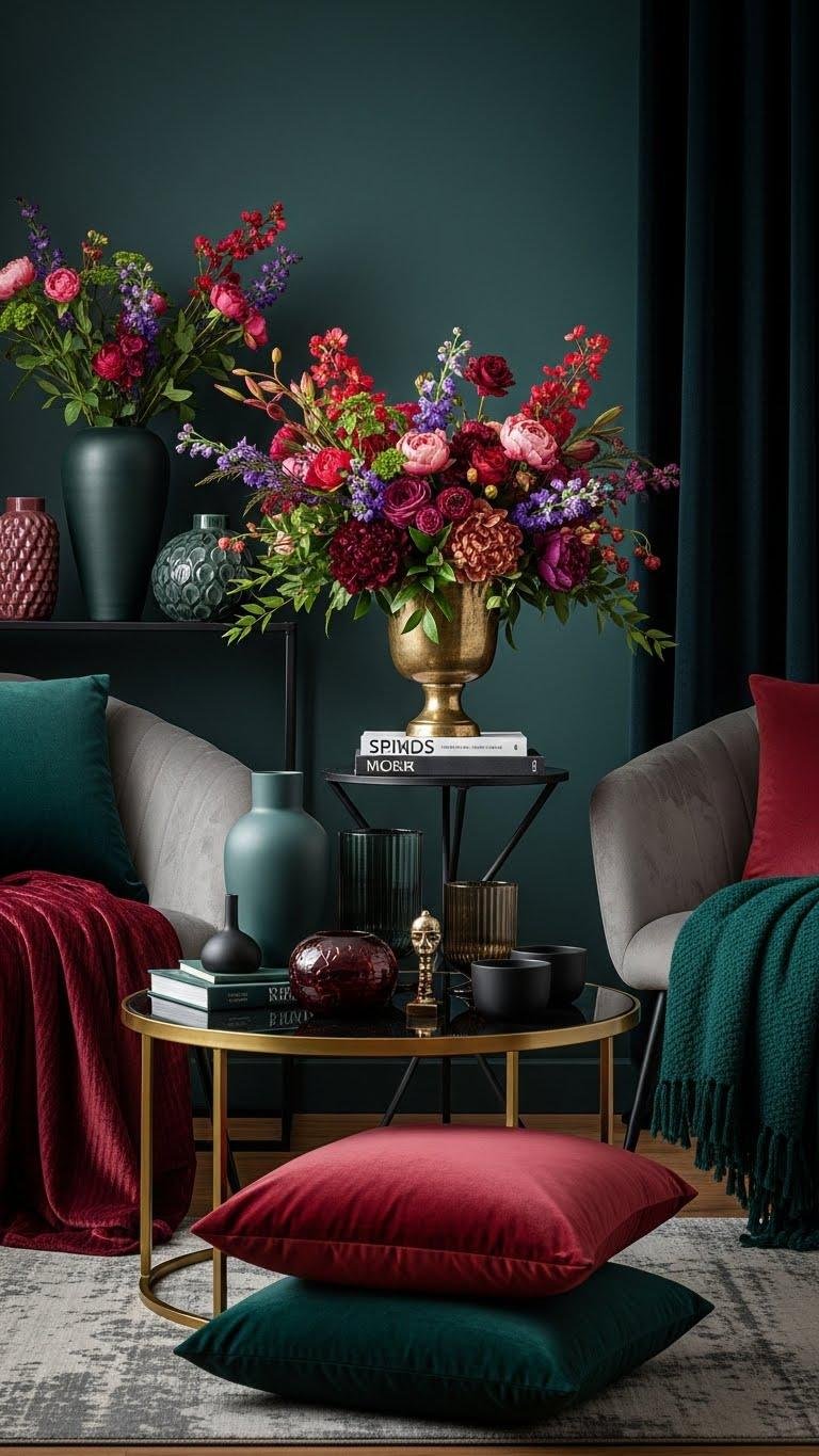 You’ll choose pieces in deep jeweltones—think vases, throws, a statement chair—so color anchors the room without overwhelming it.