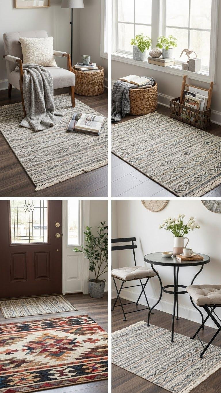 Bring in small-scale patterned rugs to anchor cozy spots and add instant warmth to a room. You’ll use patterned placement to define reading nooks, entryways, or under a café table, blending scale with bold motif. Try rug layering for texture and depth—stack a neutral flatweave under a colorful kilim. You’ll create inviting, liberated spaces without clutter or fuss.