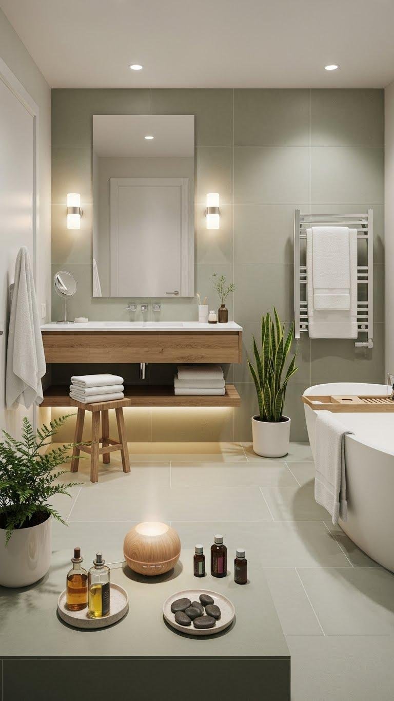 When you strip the palette back to soft neutrals and pale greens, your bathroom immediately feels calmer and more spa-like—think matte stone tiles, warm wood accents, and plush white towels that invite you to linger.