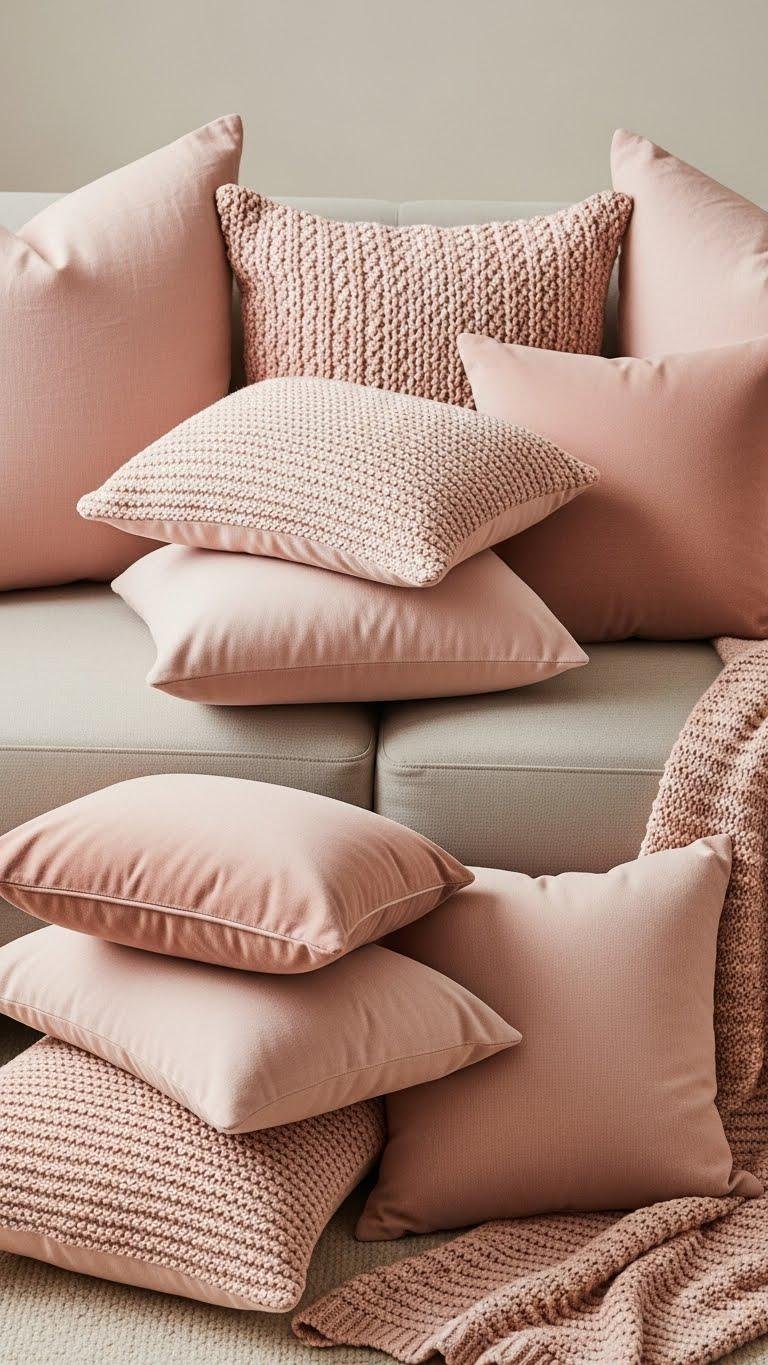 A few well-chosen blush pink throw pillows can instantly warm a neutral sofa and lift the whole room’s palette.