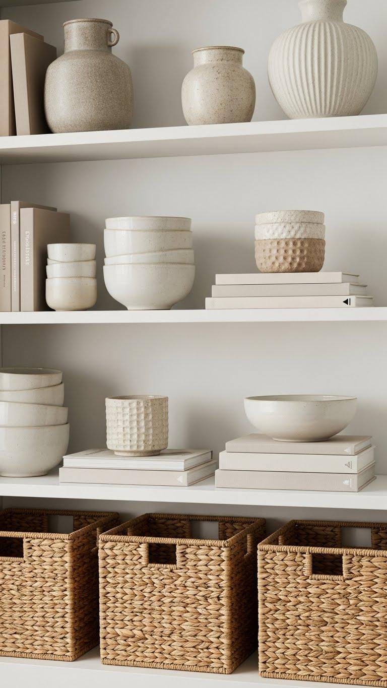 Add woven seagrass baskets for hidden storage and tactile contrast. Keep negative space, rotate items seasonally, and let the arrangement breathe so your space feels liberated and intentional.