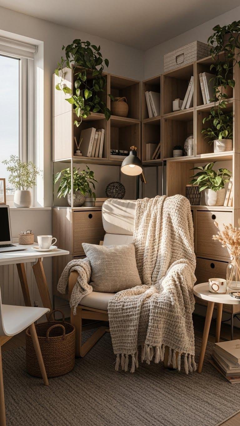 Design a mindful nook with a comfy seat, modular shelving, and plants to breathe.
