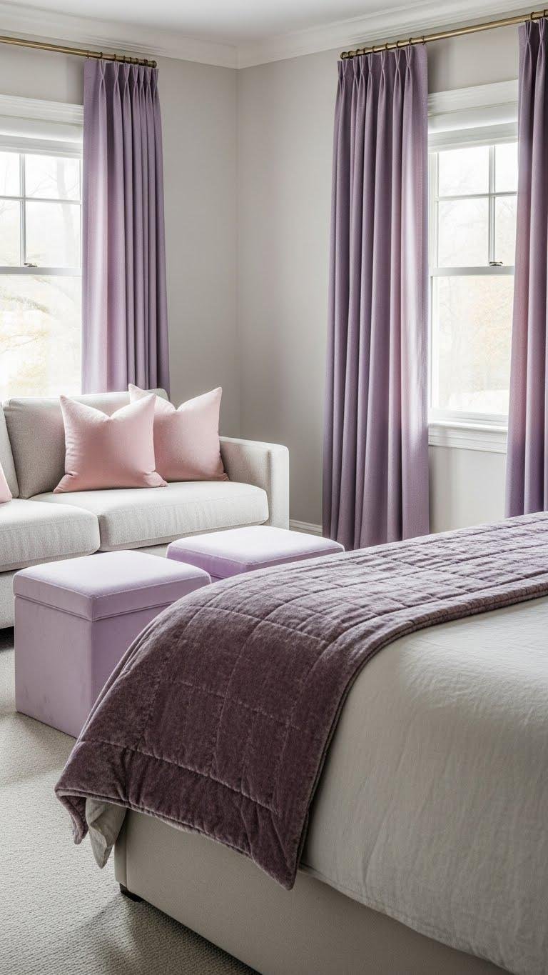 After warming a neutral sofa with blush pink pillows, carry that soft palette into the bedroom by layering lavender textiles for a restful, refined feel. You’ll choose lavender drapery to mute light and frame windows, mix linen sheets and a velvet throw, and place lilac ottomans for seating and storage. The result feels effortless, calm, and utterly liberating—sleep-ready and stylish.