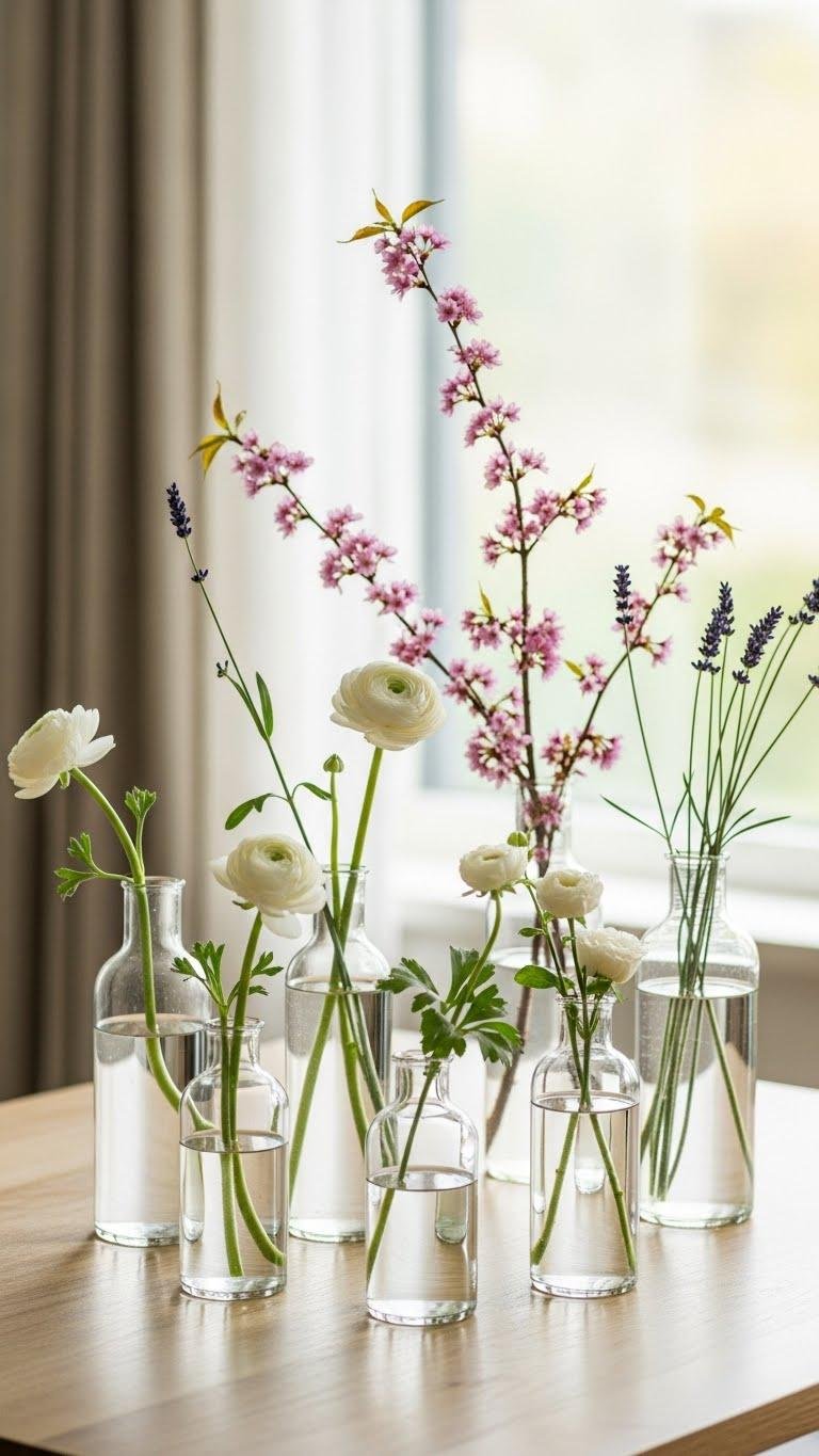Bring in fresh florals and let them do the talking in minimalist vases that emphasize shape and color without clutter. You’ll choose seasonal stems that feel effortless — single varieties or airy bunches — and pair them with simple glass buddies for light, reflective charm.