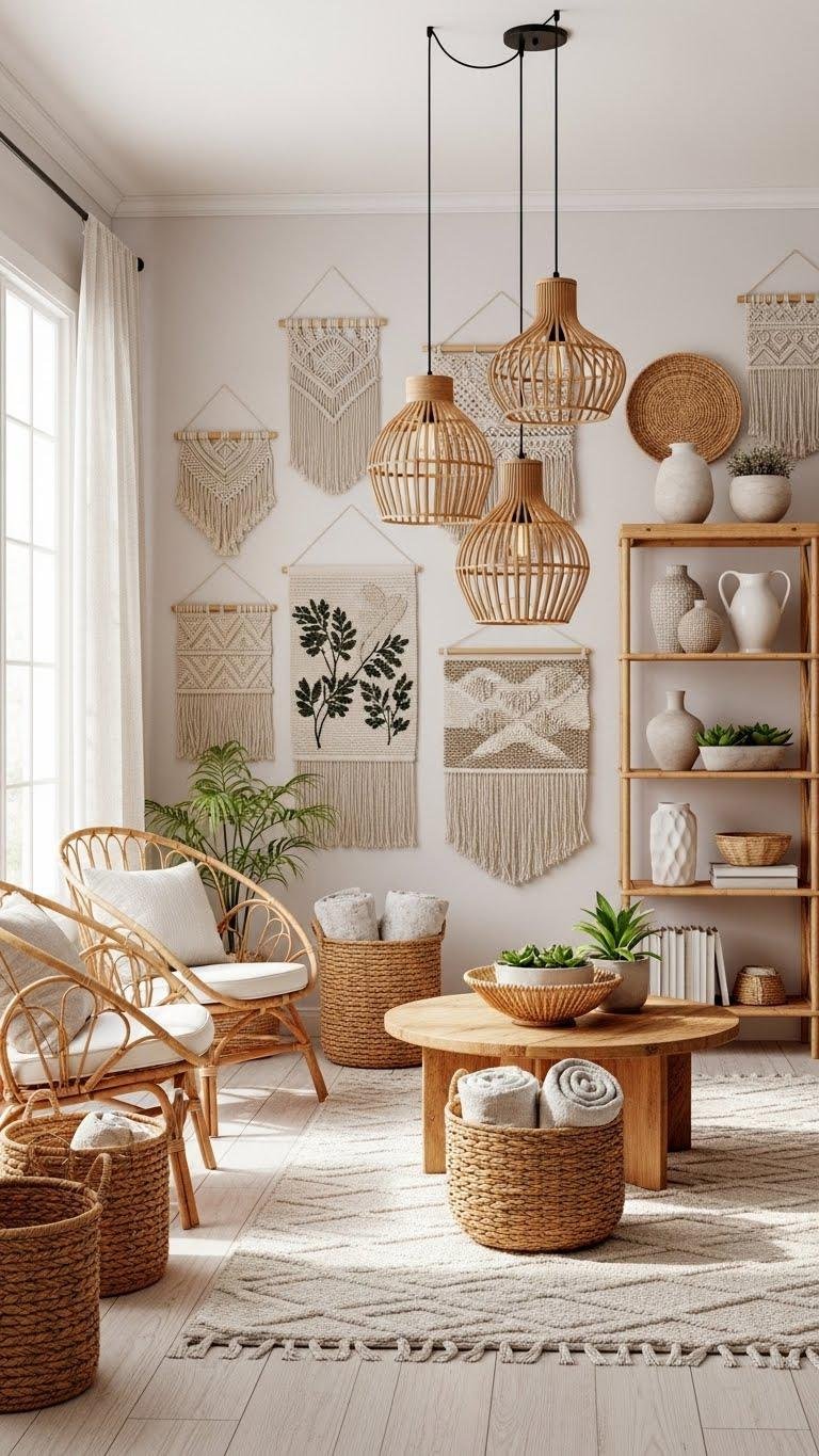 You’ll mix woven wall hangings, rattan chairs, and simple baskets to create breathable layers that feel liberated and calm. Swap heavy pieces for bamboo pendant lights and slender shelving to keep spaces light, tactile, and free-flowing.