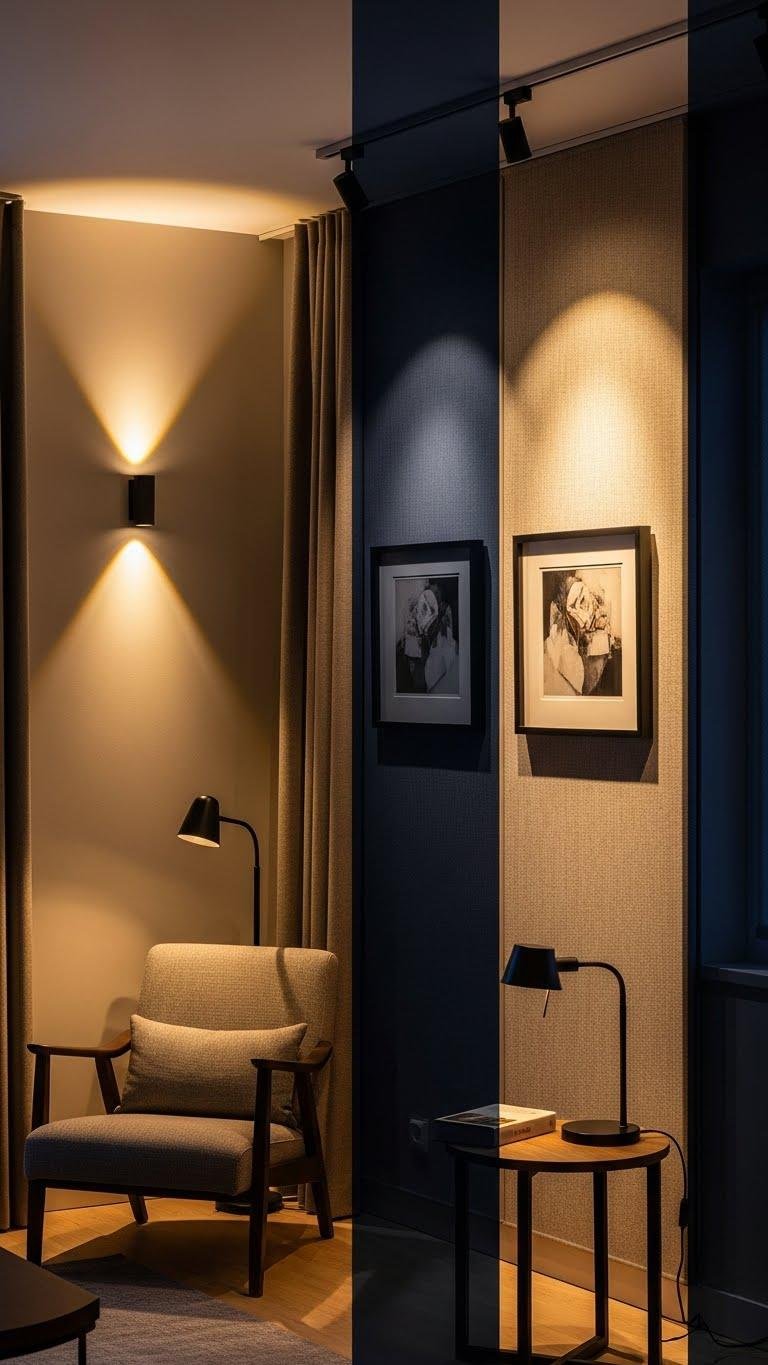 You’ll zone the room with layered sconces for reading and accents, add curtain mounted tracklights to wash fabric or art, and combine overhead, task, and accent layers so you can shift atmosphere quickly and live by your own rules.