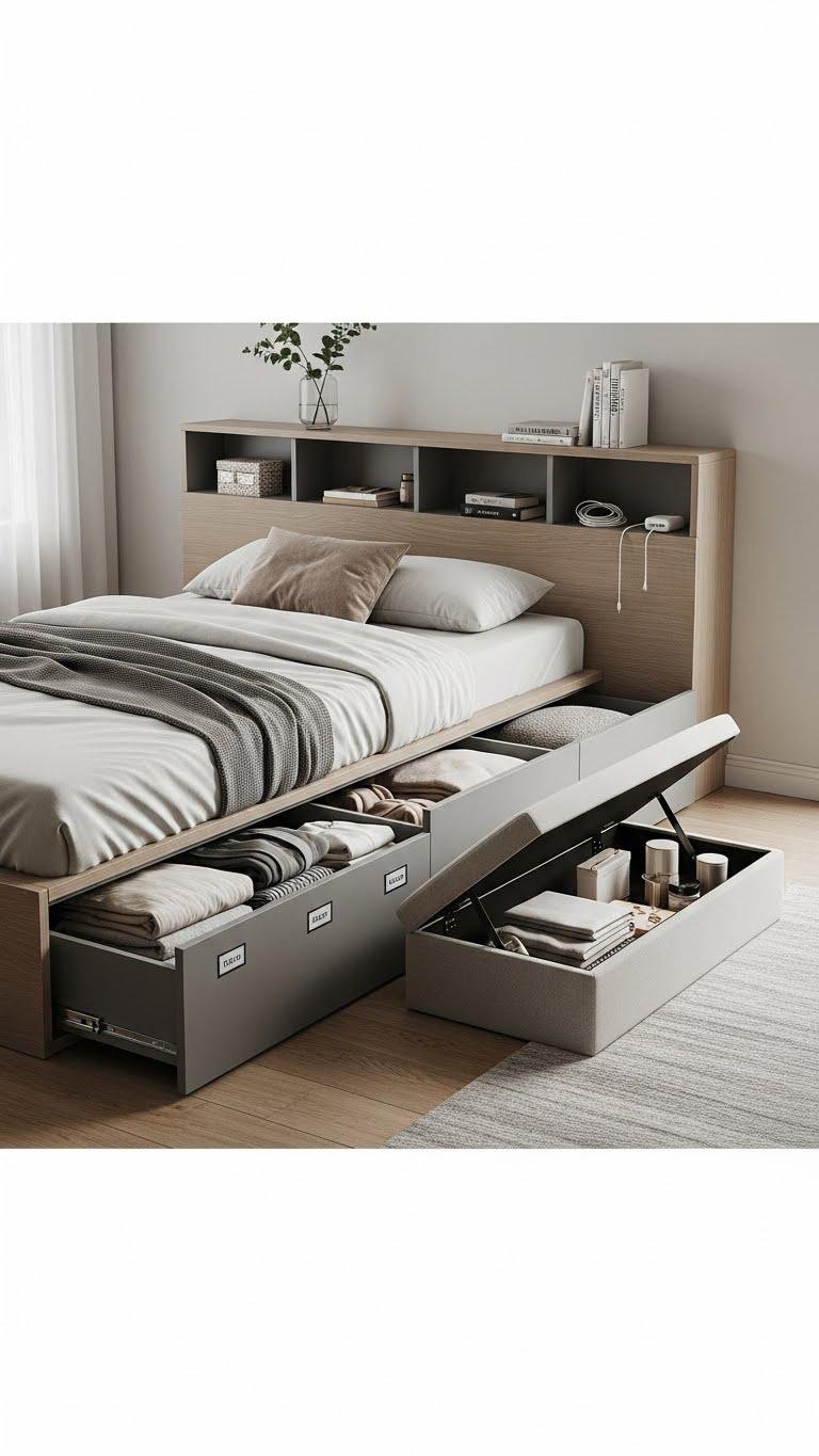 Use under‑bed compartments for seasonal gear and headboard cubbies for books and chargers; label bins, purge regularly, and keep surfaces intentionally bare.