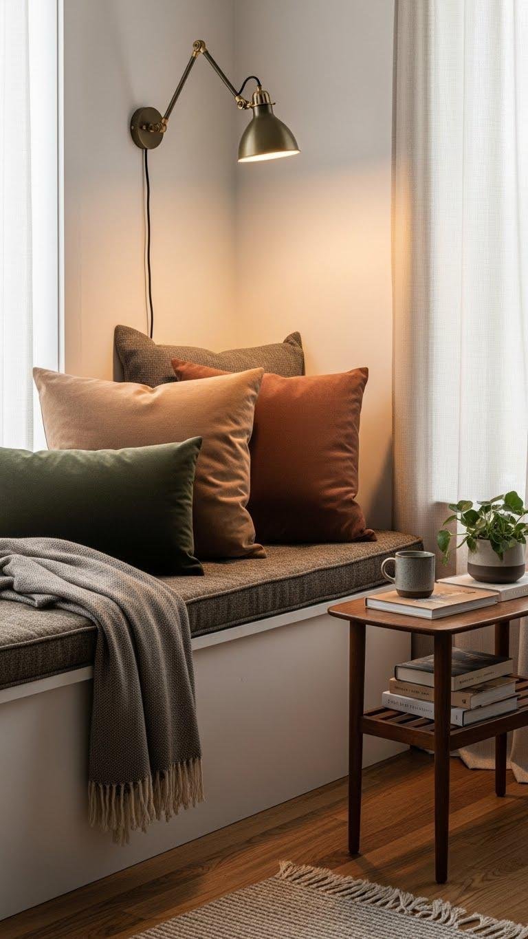 Carve a window bench or reading alcove with layered cushions, a slim side table, and directional light.