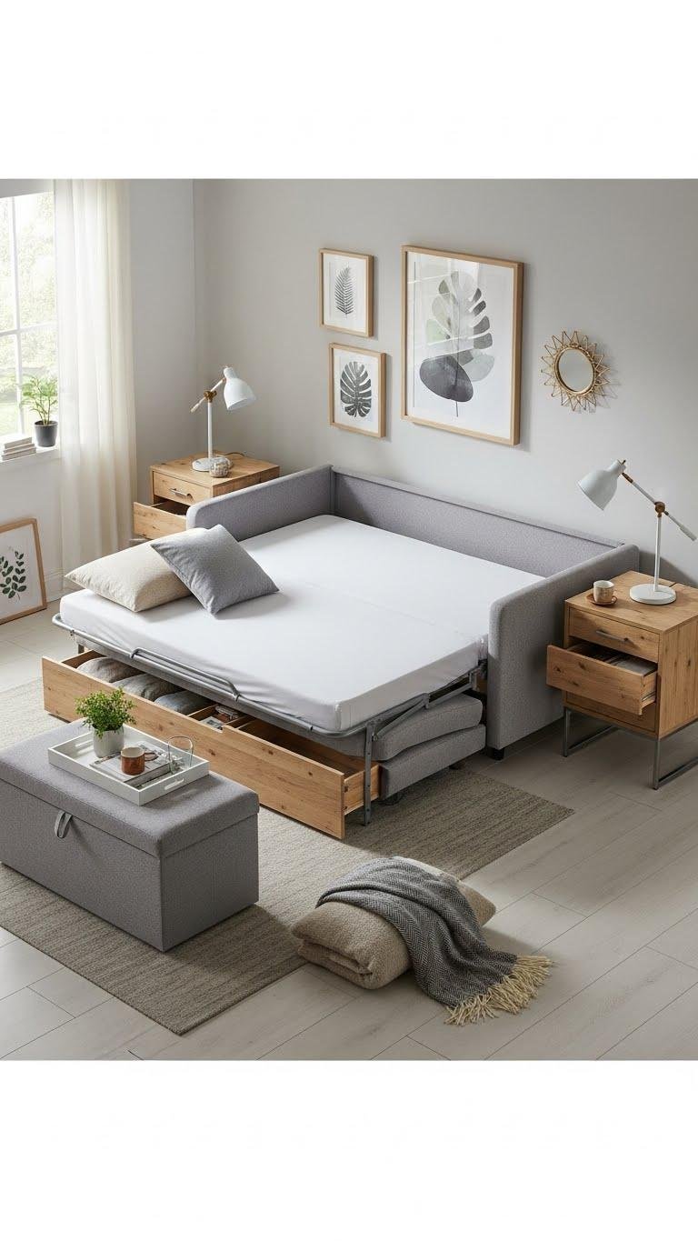 Having furniture that pulls double duty keeps your scaled layout feeling open and purposeful: choose pieces that offer storage, flexibility, or multiple functions so each item earns its footprint. You’ll favor a convertible daybed for lounging and guests, pair bedside tables with drawers, and add a storage ottoman to hide blankets or gear. Prioritize clean lines, durable finishes, and smart proportions for freedom.
