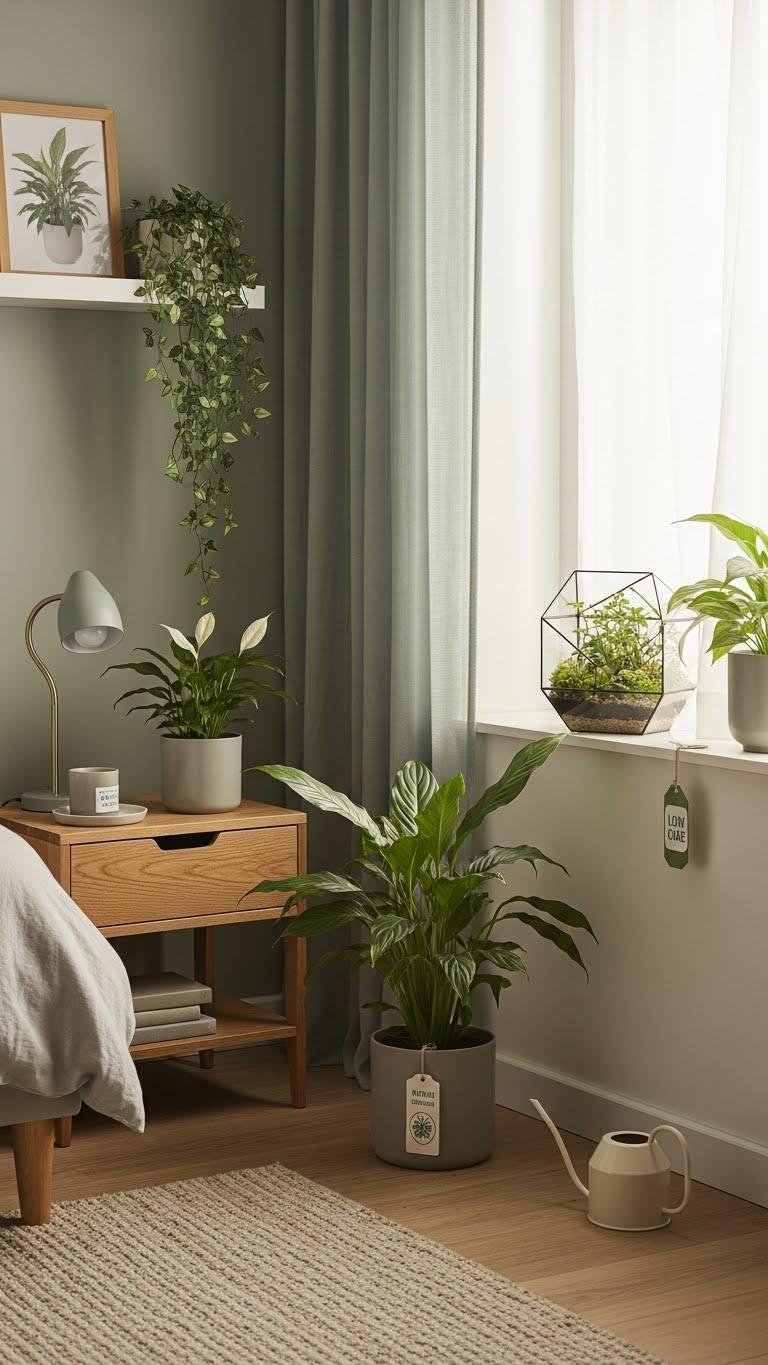 Often, adding a few well-chosen houseplants instantly calms a bedroom and improves air quality, so pick species and placements that suit your light and routine. You’ll choose air‑purifying varieties for bedside freshness, add trailing plants to soften shelving, and craft micro‑green terrariums for focused greenery. You’ll balance care demands with freedom, keeping maintenance low and style unmistakably yours.