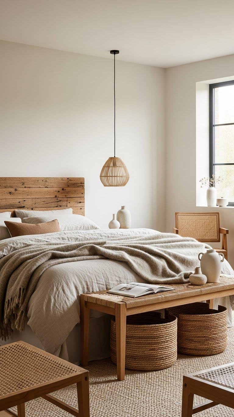 Choose linen bedding, a wool throw, handwoven baskets for discreet storage, and a reclaimed timber headboard to anchor the room. Mix matte ceramics and rattan accents, keep palettes warm and restrained, and let tactile contrast—soft against rough—define a free, modern retreat.