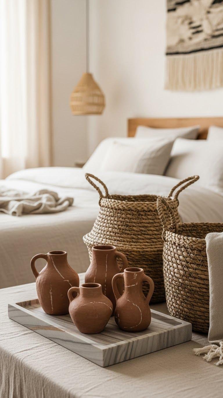Mix handmade terracotta vessels, a low stone tray, and woven seagrass baskets to add warmth, restraint, and artisanal imperfection that lets you live freely without clutter.