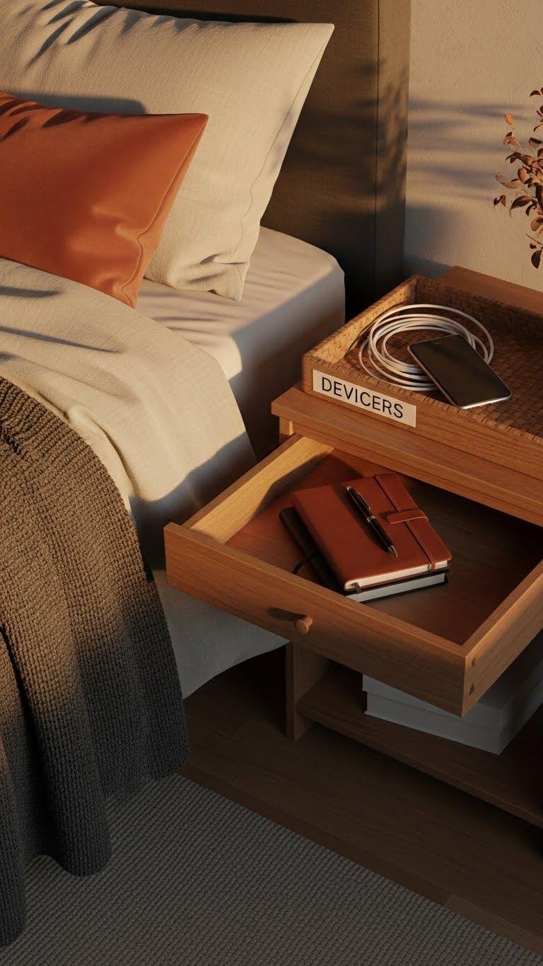 Soft textiles help muffle noise and make your bedroom feel like a sanctuary; now pair that quiet with a deliberate spot that keeps tech out of sight so your rest actually improves. Design a bedside drawer or shelf for sunset journaling, and a device basket organization system nearby for chargers.