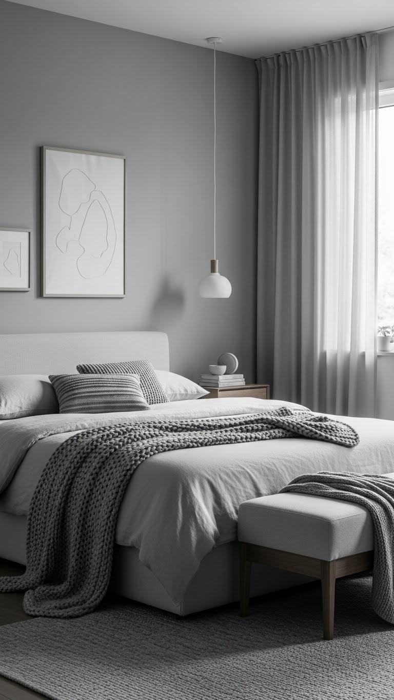 Embrace tonal gradation from deep to pale hues across walls, bedding, and upholstery so your eye flows freely. Use textured layering—throws, rugs, woven pillows—to add depth without contrast overload. You’ll achieve a liberated, modern retreat that reads refined, calm, and fully considered.
