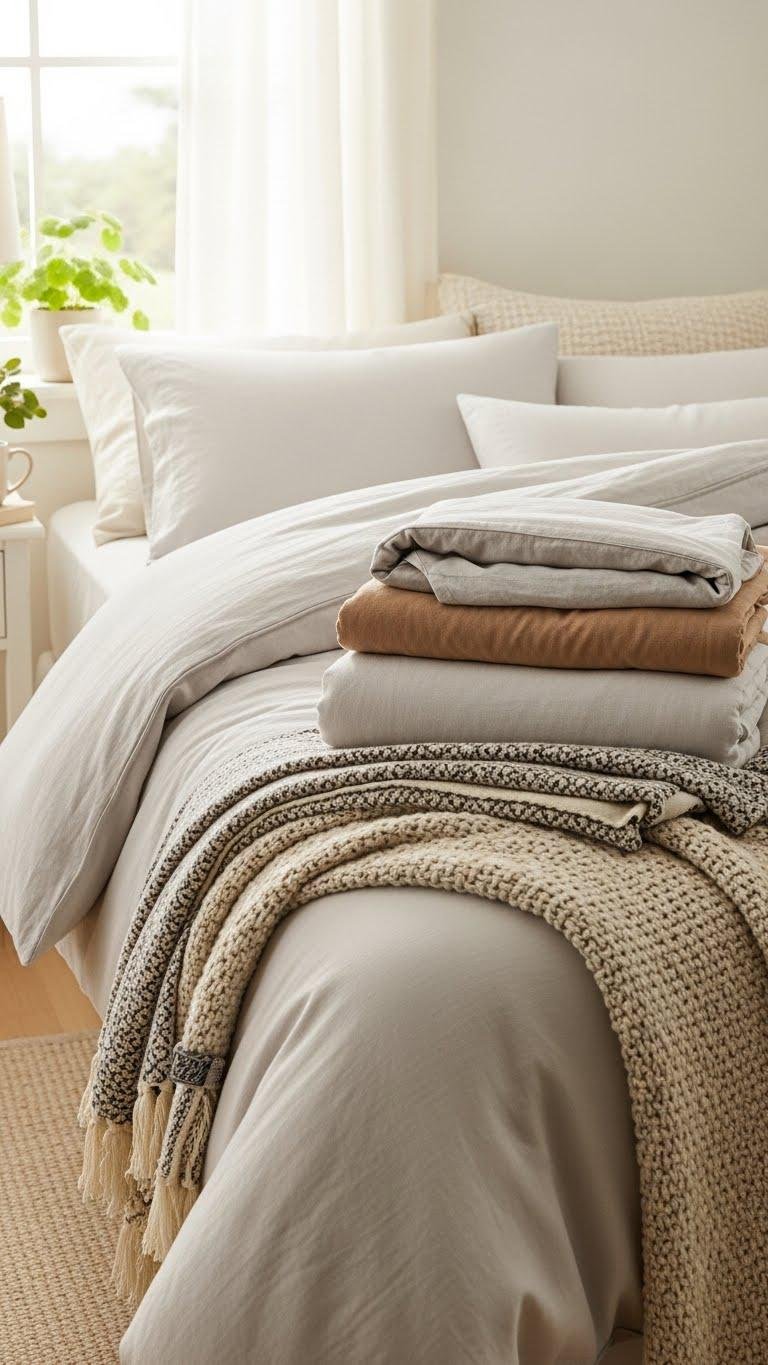 Start with a simple system: sheet, lightweight duvet, and one or two throws you can grab as the temperature shifts.